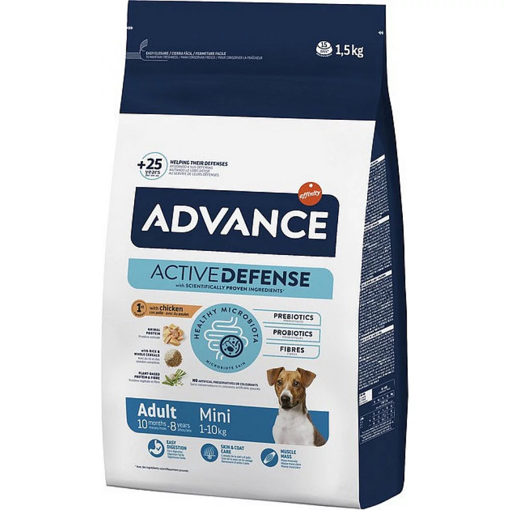 Advance Dog Mini Adult є високоякісним, збалансованим, повнораціонним кормом для дорослих собак міні-порід (вага дорослих тварин не перевищує 10 кг) у віці від 10 місяців до 8 років.