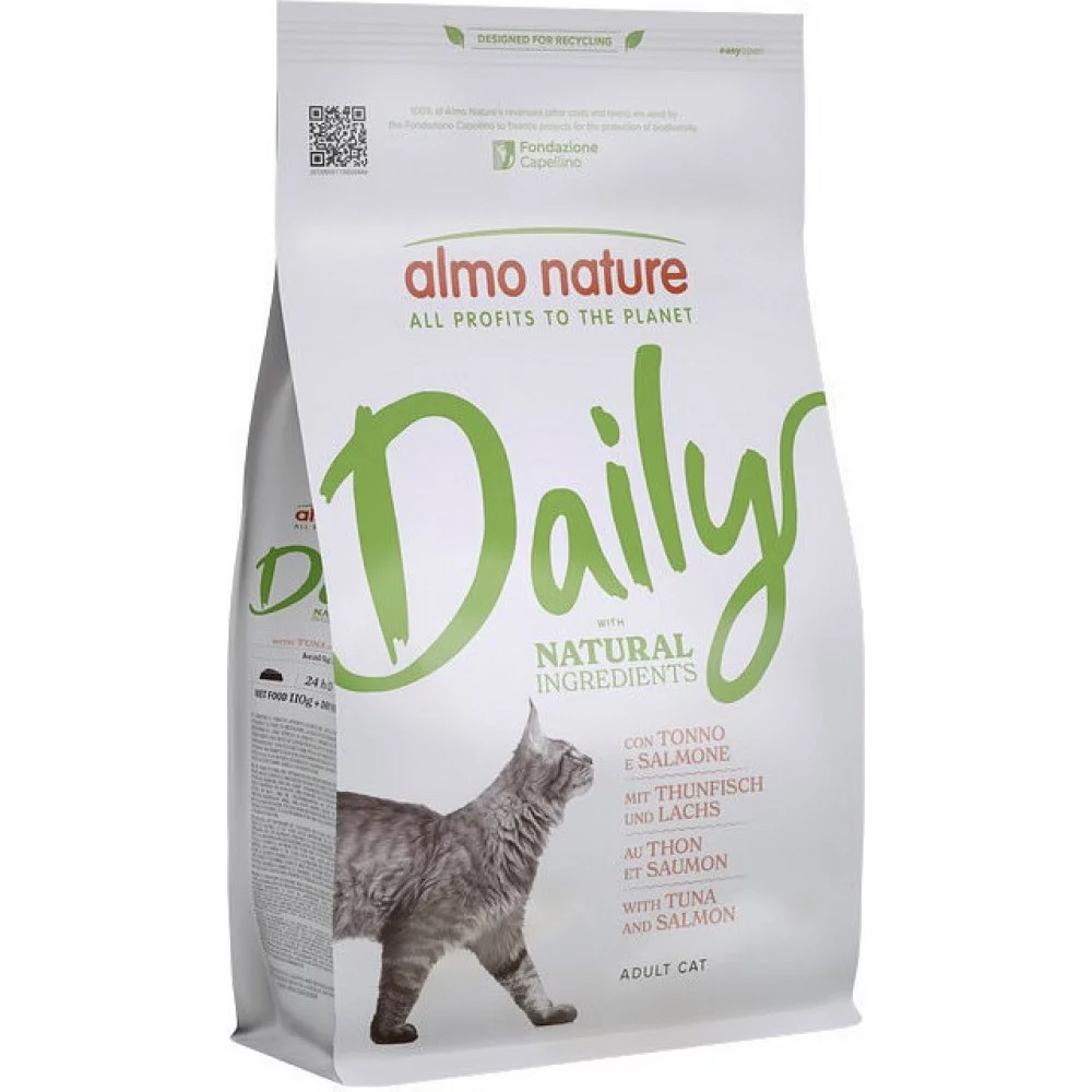 Almo Nature Daily Cat — це повнораціонний сухий корм для дорослих котів, який забезпечує збалансоване харчування за рахунок високоякісних інгредієнтів. Поєднання тунця та лосося надає корму привабливий смак і корисні властивості, що підходять для щоденного харчування.