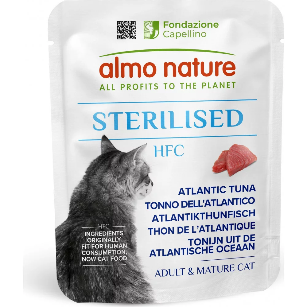 Almo Nature HFC Cat Sterilised – додатковий консервований корм для дорослих стерилізованих котів з атлантичним тунцем. Виготовлений з інгредієнтів HFC-якості, цей корм забезпечує природне джерело білка, підтримуючи здоров’я та оптимальну вагу стерилізованих котів.