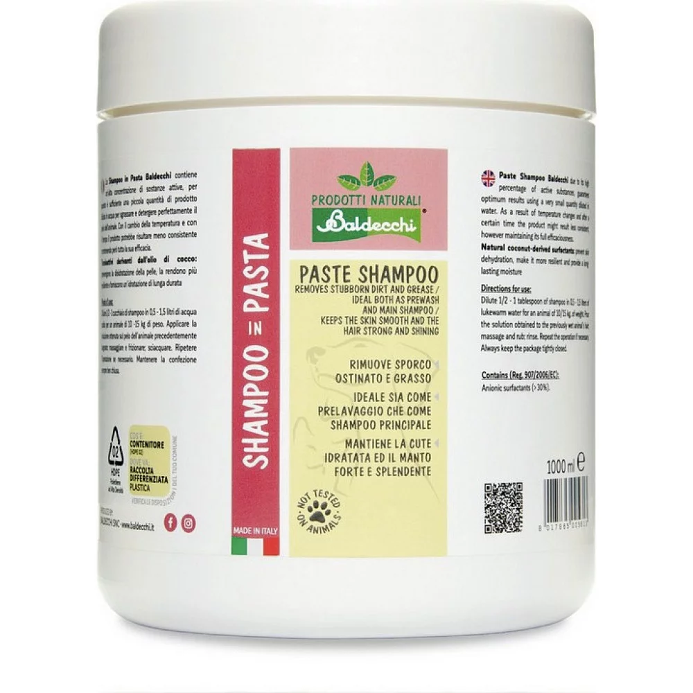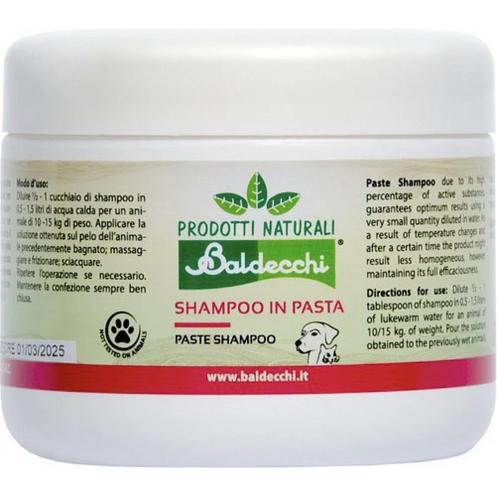 Суперконцентрований шампунь для очищення сильних, в тому числі органічних (жир, сеча, кров) забруднень на шерсті. Шампунь-Паста Baldecchi містить високе процентне відношення активних речовин. Навіть невелика кількість шампуню досить для ідеальної чистоти шерсті. Шампунь-Паста може змінювати свою консистенцію в залежності від зміни температури, не втрачаючи при цьому своїх якостей. Відмінно відмиває складні забруднення.