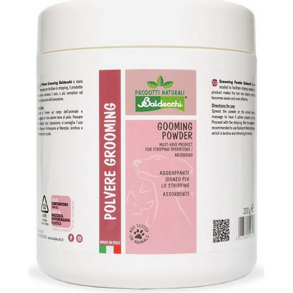 Пудра для грумінгу Baldecchi спеціально розроблена для підготовки тварин до рингу. Вона робить шерсть пухнастою, більш об'ємною та полегшує укладку. Пудра також ідеальна перед тримінгом, оскільки зменшує слизькість шерсті, що дозволяє легше працювати з нею. Важливо, що пудра не залишає білого нальоту, що забезпечує чистоту і акуратний вигляд тварини.