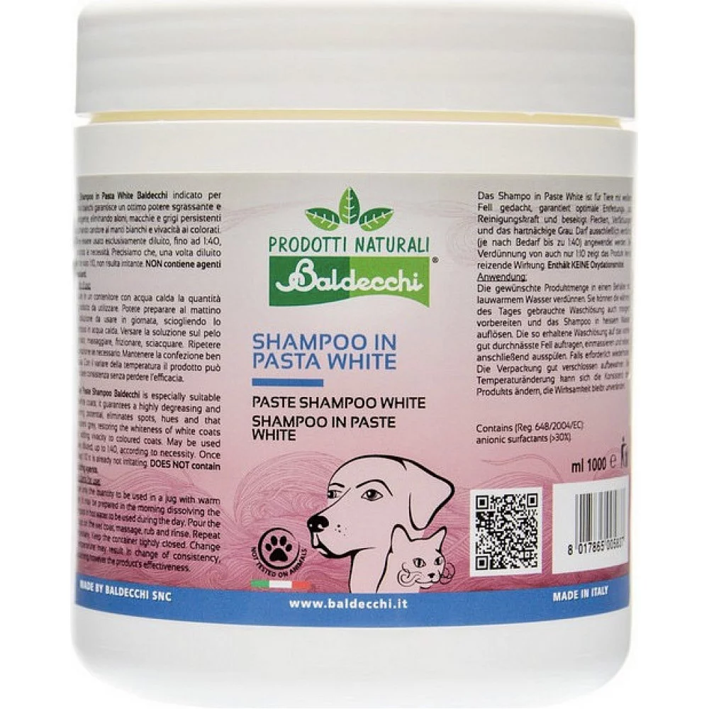 Білий шампунь-паста Baldecchi спеціально розроблений для тварин із білою шерстю. Завдяки високій концентрації активних компонентів шампунь ефективно очищує шерсть, усуваючи органічні забруднення, жовтизну, сірий наліт та плями від сечі. Унікальна формула White Più® надає шерсті яскравості, блиску та доглянутого вигляду.