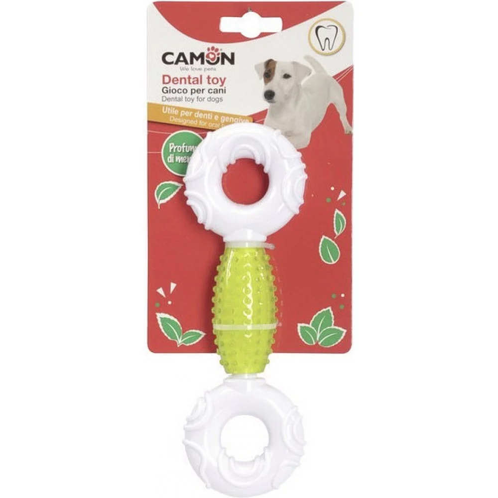 Іграшка CAMON "Гантель з двома кільцями і ароматом м'яти" 20 см – міцна та функціональна іграшка для собак, що поєднує нейлон і термопластичну гуму (TPR), забезпечуючи довговічність і безпеку під час гри. Завдяки формі гантелі та вбудованому аромату м’яти, вона ідеально підходить для жування, тренування та догляду за зубами.