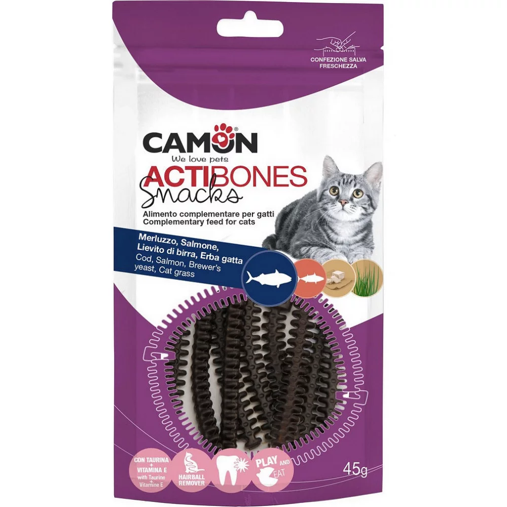 Смачні та корисні снеки CAMON ACTIBONES створені спеціально для вашого улюбленця. Завдяки натуральним інгредієнтам, таким як тріска, курка, пивні дріжджі та котяча м’ята, ці ласощі сприяють підтримці здоров'я та гарного настрою котика. Вони мають привабливий смак та аромат, що сподобається навіть найвибагливішим котам.