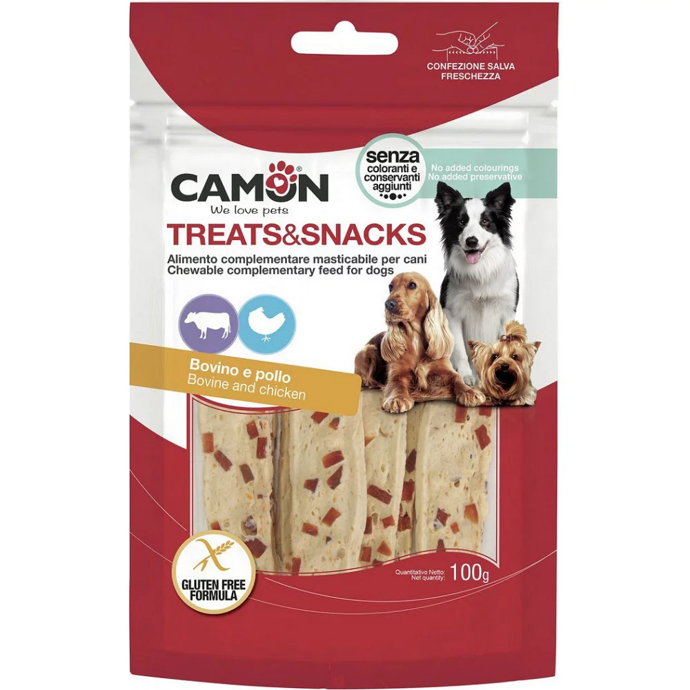 Снек для собак CAMON джеркі з яловичої шкіри і шматочками курки – це смачні та поживні ласощі, виготовлені з високоякісних інгредієнтів. Кожна упаковка містить 100 г продукту, який забезпечує вашого улюбленця корисними поживними речовинами та допомагає підтримувати здоров'я зубів.
