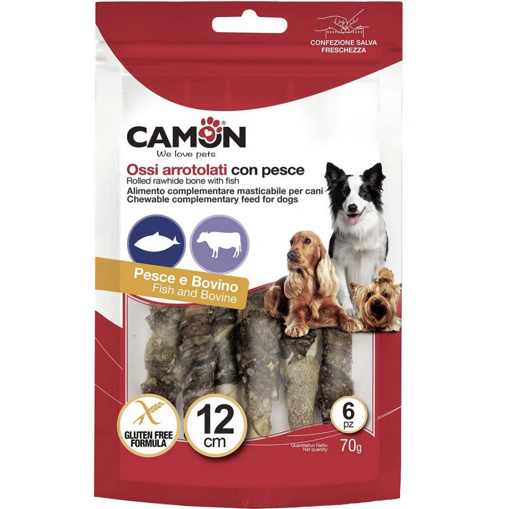 Снек CAMON "Палички з яловичої шкіри, обмотані рибою" – смачний та корисний спосіб підтримати здоров'я вашого собаки, забезпечуючи йому задоволення від жування.