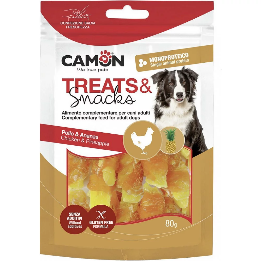 Снек CAMON "Шматочки ананаса з куркою" – це оригінальне та корисне частування для вашого улюбленця, яке поєднує натуральний смак ананаса та високоякісне куряче м’ясо. Такий делікатес не тільки задовольнить смакові потреби вашого собаки, а й забезпечить його цінними поживними речовинами.