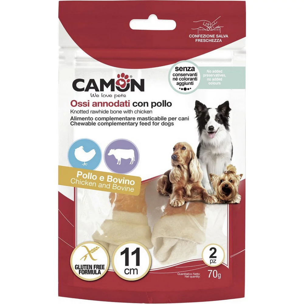 Снек для собак CAMON в'язана кістка з яловичої шкіри з куркою, 11 см (70 г). Додаткове харчування для дорослих собак.